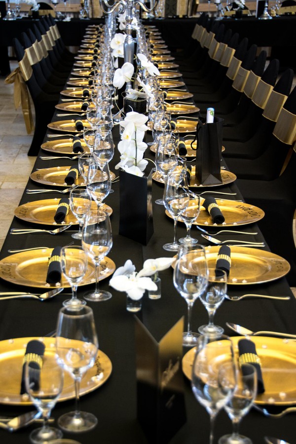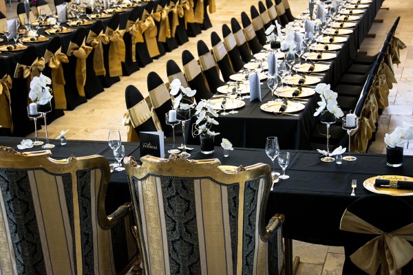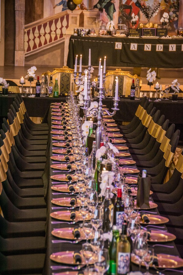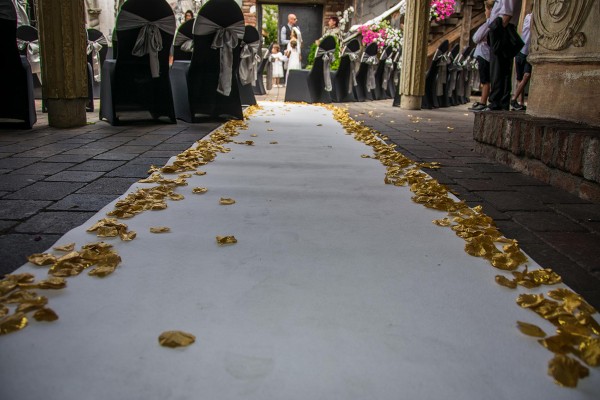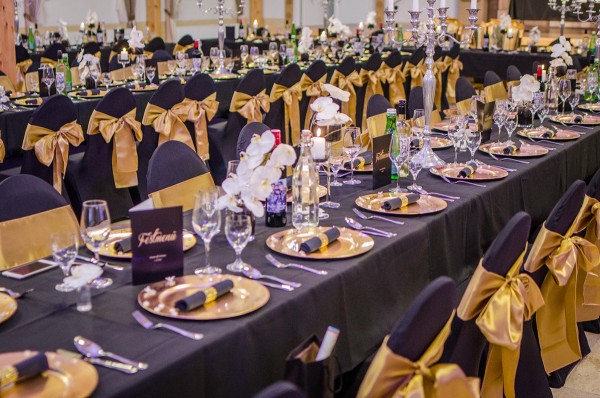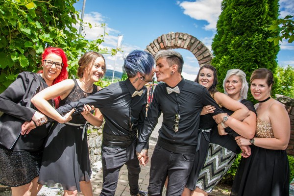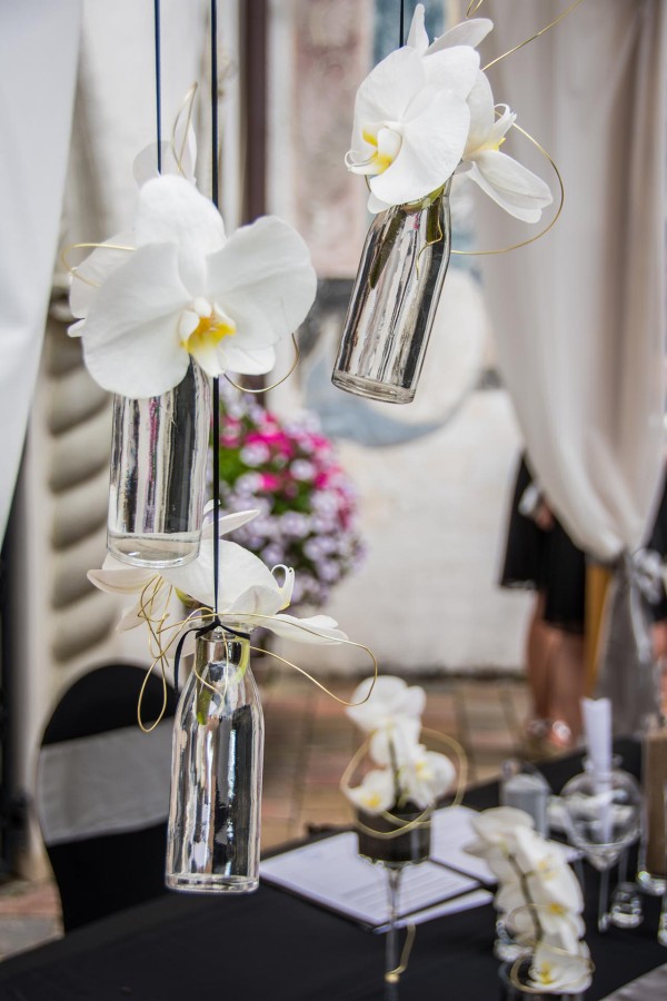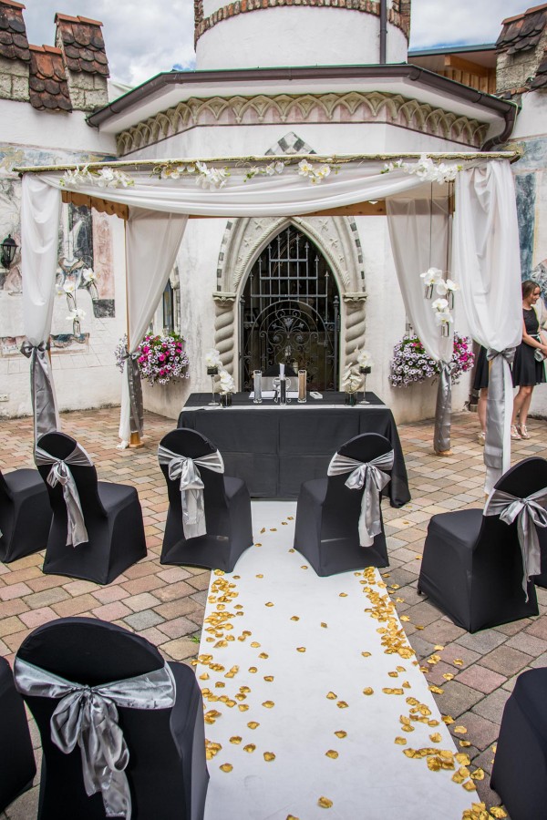 Abseits vom allgegenwärtigen Weiß, wurde die Farbe Schwarz zum Mittelpunkt der Hochzeit – welche wir mit gold und silber veredelt haben. Einzigartig waren auch die maßgeschneiderten Anzüge für die beiden Bräutigame. Auch die Hochzeitsgesellschaft war sehr stilvoll und dem Motto gemäß gekleidet und rundete das Bild unseres Gesamtkonzepts perfekt ab. Nach einer wunderschönen Trauung mit Sondzeremonie im Innenhof einer Burg, ließ das Bräutigampaar Tauben fliegen und verzauberte damit die Gäste.