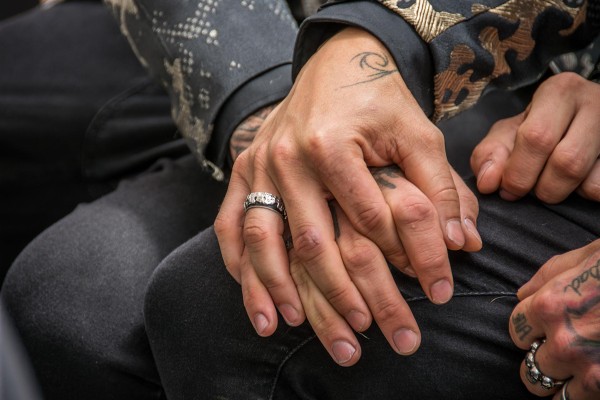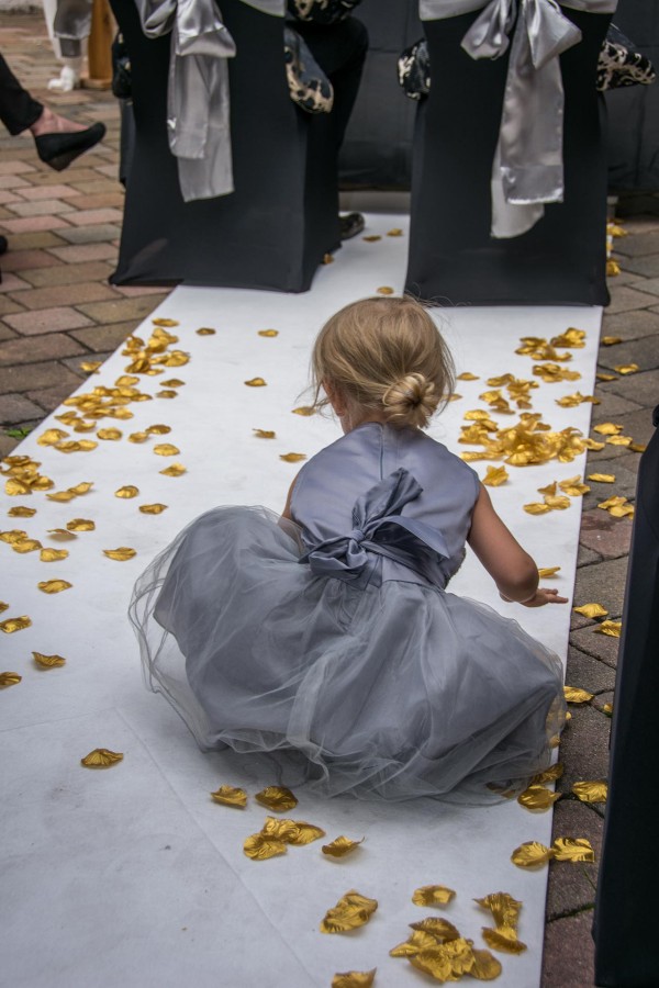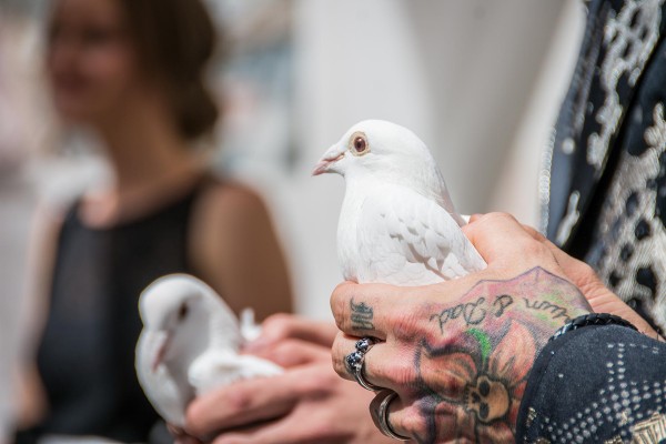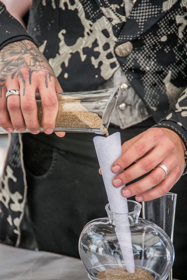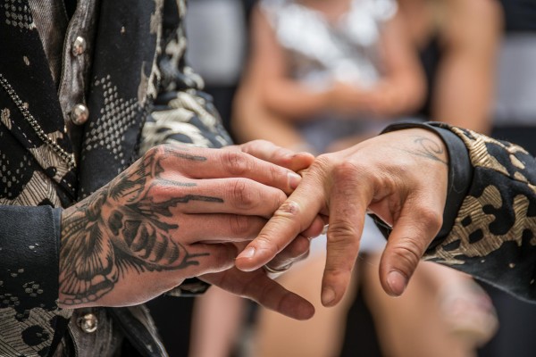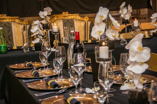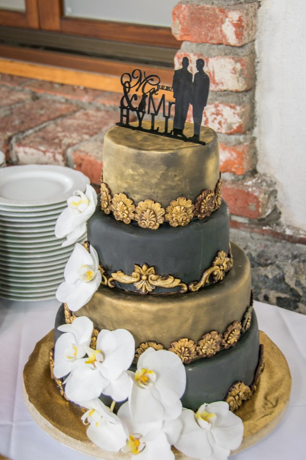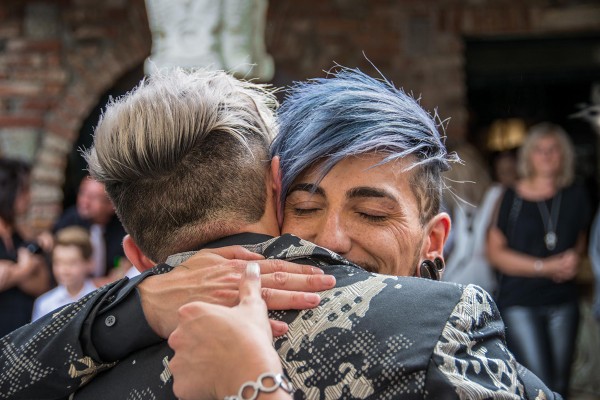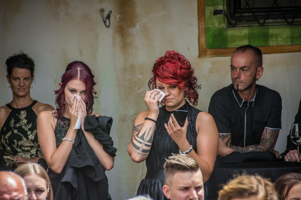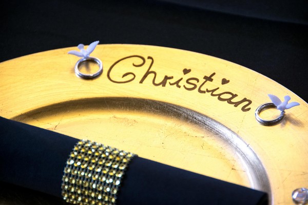 Abseits vom allgegenwärtigen Weiß, wurde die Farbe Schwarz zum Mittelpunkt der Hochzeit – welche wir mit gold und silber veredelt haben. Einzigartig waren auch die maßgeschneiderten Anzüge für die beiden Bräutigame. Auch die Hochzeitsgesellschaft war sehr stilvoll und dem Motto gemäß gekleidet und rundete das Bild unseres Gesamtkonzepts perfekt ab. Nach einer wunderschönen Trauung mit Sondzeremonie im Innenhof einer Burg, ließ das Bräutigampaar Tauben fliegen und verzauberte damit die Gäste.